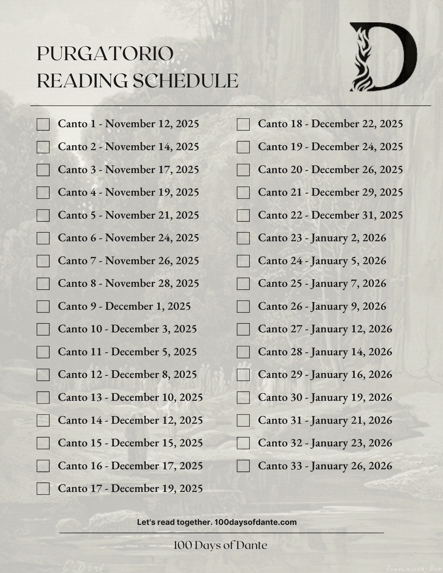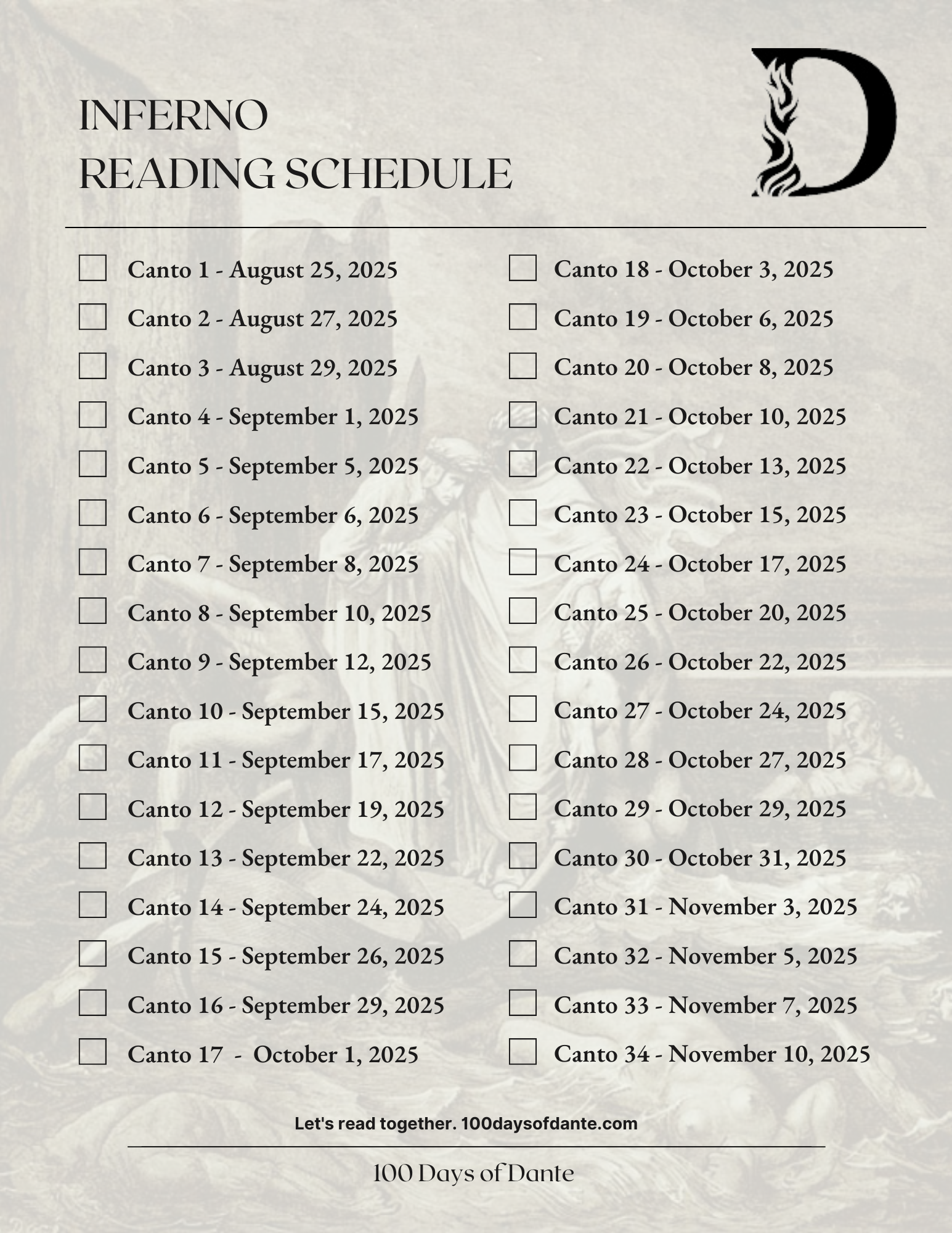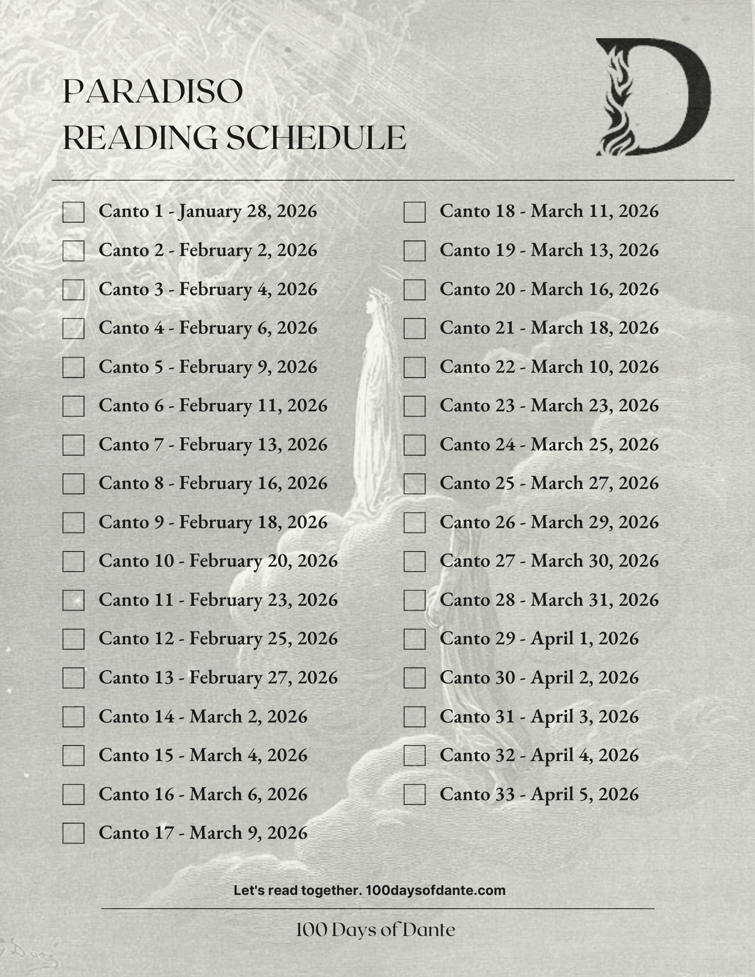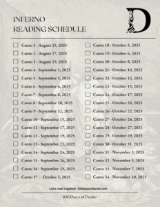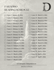 Looking for a reading schedule to keep you on track? You can find that here! Here are printable PDF generic reading logs for Inferno, Purgatorio, and Paradiso: